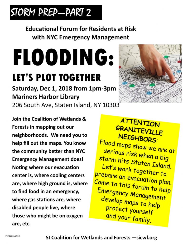 Gabriella Velardi-Ward, coordinator of the Staten Island Coalition for Wetlands and Forests (CWF), explains what’s happening in their battle to save the 18 acre portion of the Graniteville Wetland/Swamp. Using caution tape, the members of CWF join in outlining the vernal pond that is under the jurisdiction of the U.S. Army Corp of Engineers. No construction can take place within this area due to its jurisdiction. If this forested wetland is not saved, instead of flood waters protection, the surrounding community will have 18 acres of hard surface. This commercial project will contain a big box store, BJs, a parkng lot for 835 cars, a gas station and two other large buiildings. If this happens, the surrounding Environmental Justice community will be at greater risk of climate change flooding. Gabriella explains that this forested wetland protected the surrounding community from flooding during Hurricane Sandy. She explains some of the legal process as well as the climate emergency implications due to the loss of our green infrastructure. The dream of CWF is to create a nature trail park here, with an educational focus, to teach children as well as adults the importance of trees, wetlands and all of nature, to our health and our future.